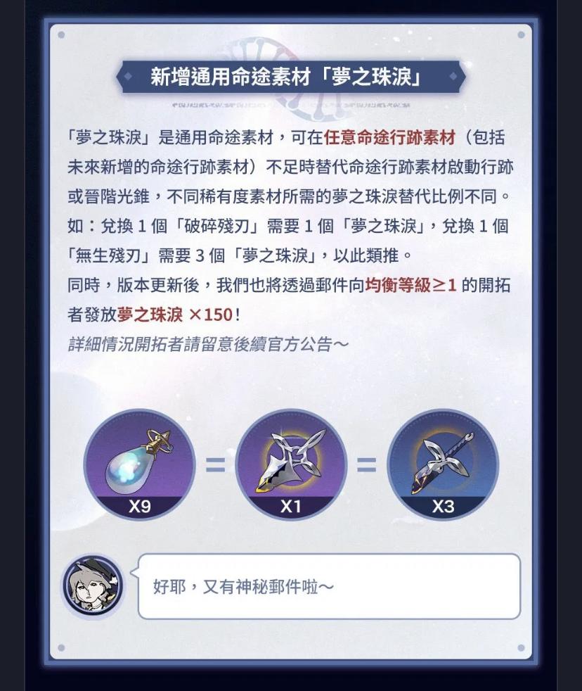 完整內容請自行去看圖片 https://hoyo.link/80GCFBAL?q=24OP0FvZ7v1 每日任務變成八個自選 無名勳禮移除日任,改良週任,開拓力消耗變成週任的疊加式任務 新增通用行跡素材 可直接打未開放的素材關 可以在一些任務內看地圖與任務目標 改良敵方資訊的顯示方式 可編成九支隊伍 開拓任務的難度與需求等級下修 評書奇譚變常駐活動 -- On the surface, the scientist invests the power of his mind in a single miraculous idea and naturally begins to rise above his fellows. But the parasites say "NO! Discovery must be regulated! It must be controlled and finally surrendered." ─Andrew Ryan -- ※ 發信站: 批踢踢實業坊(web-ptt.org.tw), 來自: 114.137.68.42 (臺灣) ※ 文章網址: https://web-ptt.org.tw/miHoYo/M.1703224885.A.9A2