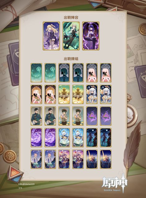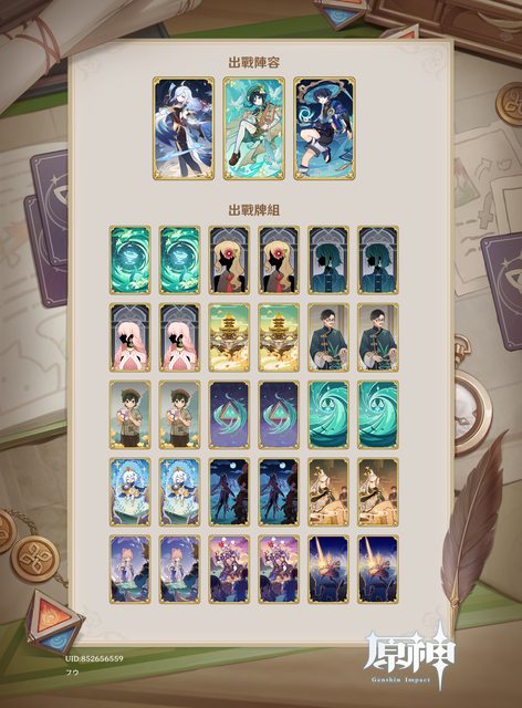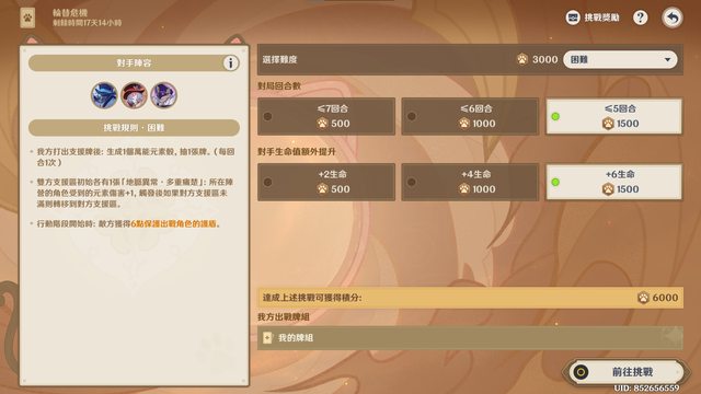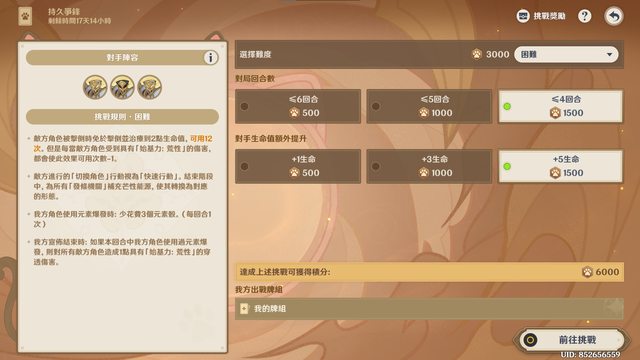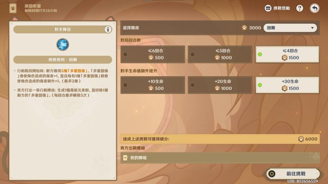 我的組牌思路是打擴散,因此先選擇菲謝爾,接著看到本關BUFF跟元素爆發有關,直覺地選雷神作為第三隊友,除了雷神充能拐外還能湊雙雷拿共鳴。