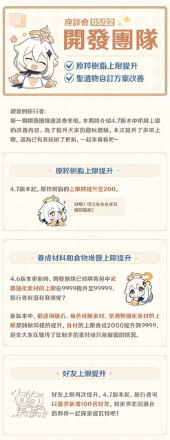 推 ClawRage: 樹脂可以累積200,以後不用玩濃縮樹脂了 05/22 10:43