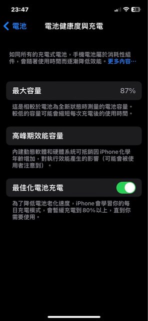 小刮痕(應為裝殼入塵磨損)。電池健康度87%,ios版本16.6.1,有貼鏡頭背版保護貼、閃