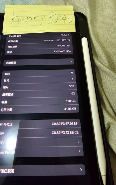 物品狀況:正常使用 無維修 無明顯刮傷 電池健康度100% Apple pencil 筆頭稍微磨損
