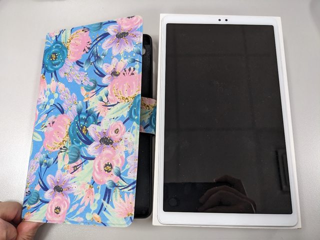 盒裝內含:平板本體、原廠充電器(未拆)、充電線(未拆)、副廠掀蓋式保護套
