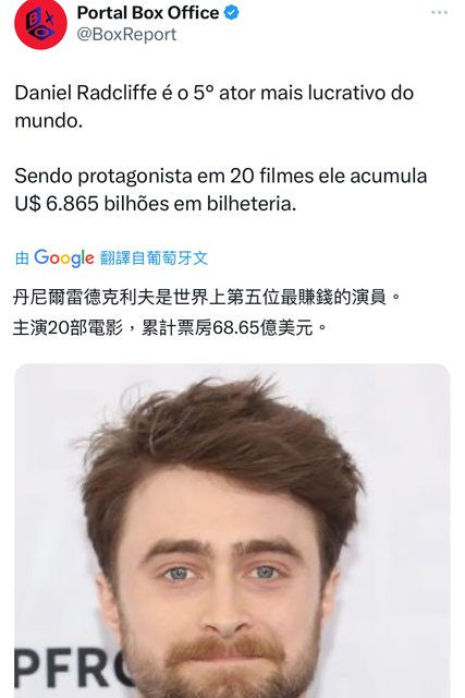丹尼爾雷德克里夫是世界上第五位最賺錢的演員。主演20部電影,累計票房68.65億美元