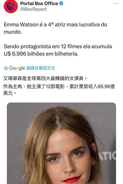 艾瑪華森是全球第四大最賺錢的女演員。