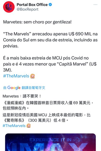請不要哭! 《驚奇隊長2》 在韓國首映首日票房收入僅 69 萬美元,包括預映在內。 這是新冠疫情后美國 MCU 上映成本最低的電影,比《驚奇隊長》(300 萬美元)低4倍。 https://i.imgur.com/QA04XI7.jpg