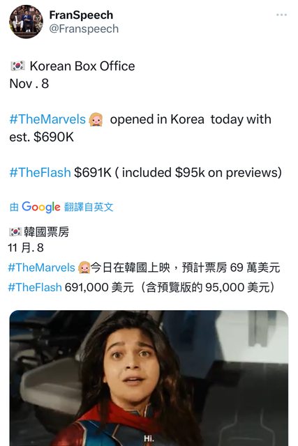 韓國票房 11月8日 《驚奇隊長2》今日在韓國上映,預計票房 69 萬美元 《閃電俠》 691000 美元(含預覽版的 95,000 美元) 資料來源:X https://i.imgur.com/QKa7YdR.jpg