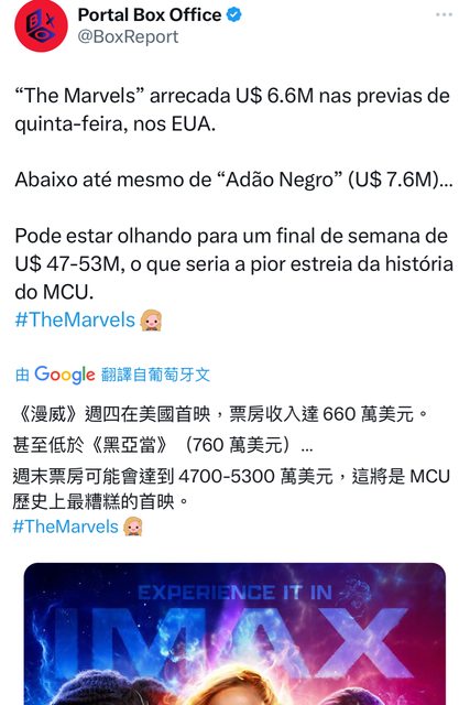 推 razzL1225 : 驚奇2大概要挑戰終局後最低,比黑寡婦還低?11/11 14:16