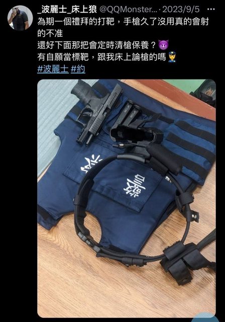 此外,他還上傳警用槍械、防彈背心的照片,另貼文稱「為期一個禮拜的打靶,手槍久了