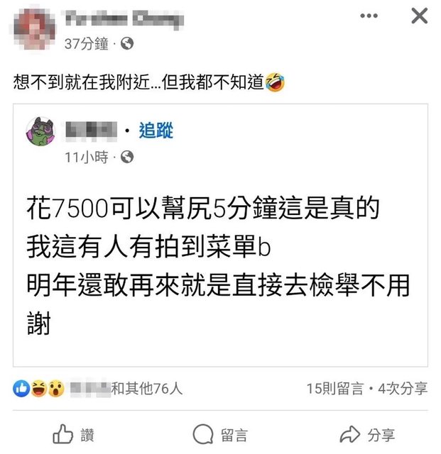會不會有盤?另名網友也說花7,500元可以幫尻5分鐘,有人有拍到菜單B,嗆明年再來就
