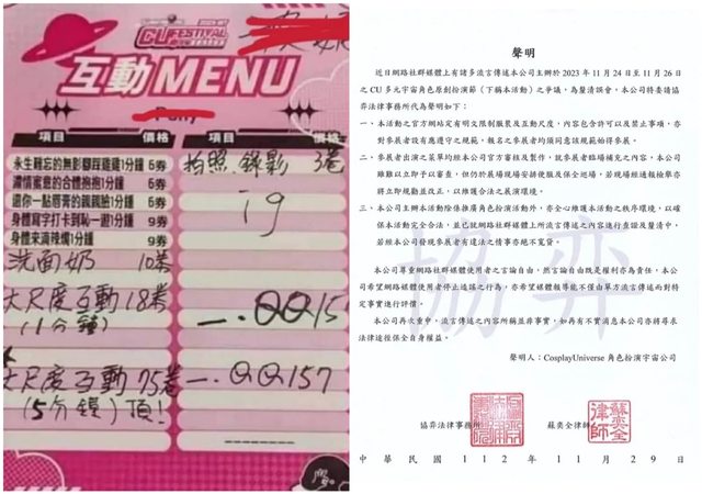 網友流出疑似CU角色扮演宇宙攤主服務菜單(左)。主辦方也發出的律師函緊急聲明(右
