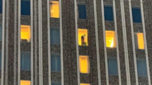 男伴在會場對面的飯店忘情激吻,全然忘記身後的落地窗已經無情出賣自己。