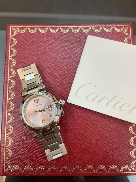 Cartier pasha 粉紅色面盤,夢幻中帶著浪漫 ,大盒已破損只剩保卡、說明書,多餘表節不小心連盒丟棄,手圍15.5內可帶 預售52000