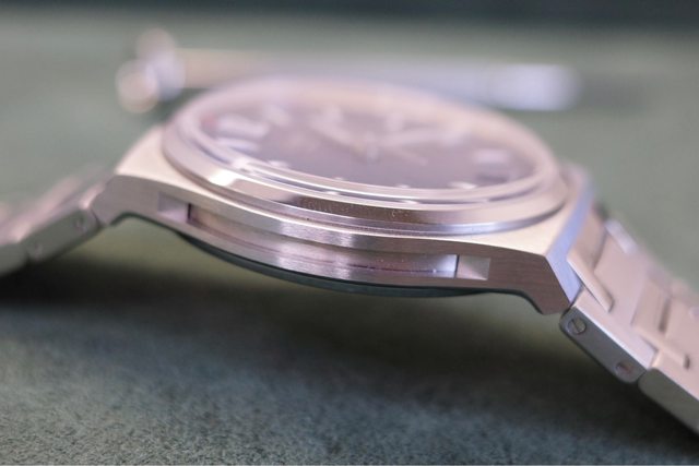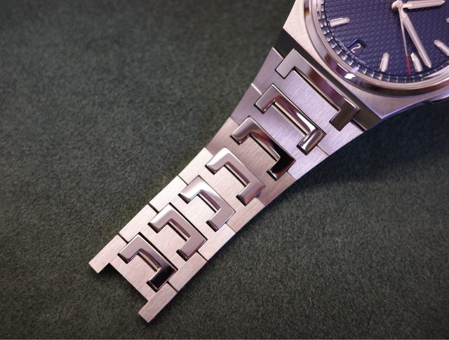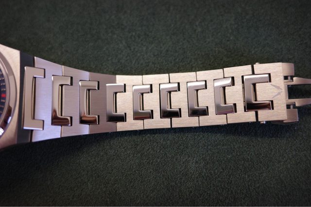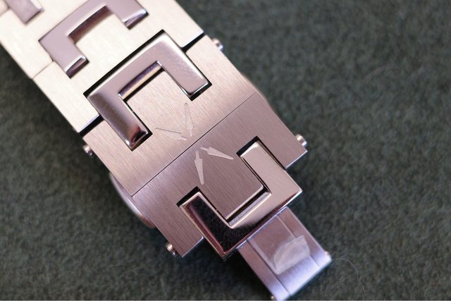 面盤是連續的立體凹凸梯形設計,整體就是大三針帶六點鐘方向日期,面盤的對稱感更佳